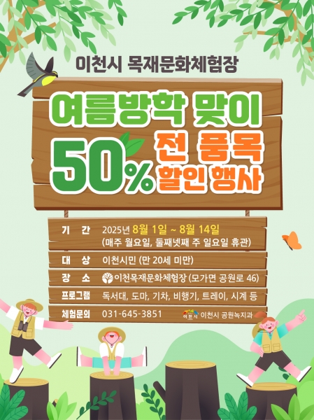 이번 행사는 8월 1일(금)부터 8월 14일(목)까지 이천시 목재문화체험장(이천시 모가면 공원로 46)에서 진행되며 관내 어린이 및 청소년(만 20세 미만)을 대상으로 한다.