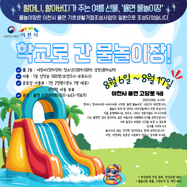 작년 첫 운영 당시 큰 호응을 얻었던 ‘율면 어린이 물놀이장’의 성과를 바탕으로 올해는 더 넓은 장소와 철저한 준비를 통해 성인 전용 풀장까지 마련해 아이들뿐 아니라 보호자와 어르신도 함께 물놀이를 즐길 수 있는 ‘세대 통합형 여름 축제’로 기획됐다.
