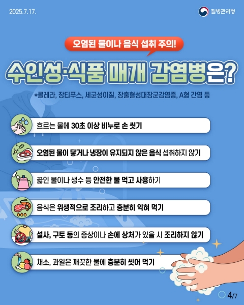 보건소는 수인성 감염병 예방을 위해 흐르는 물에 30초 이상 손을 씻고 끓인 물이나 생수를 마시며 손에 상처가 있을 경우 음식 조리를 피하고 음식은 반드시 익혀서 먹을 것을 당부했다.