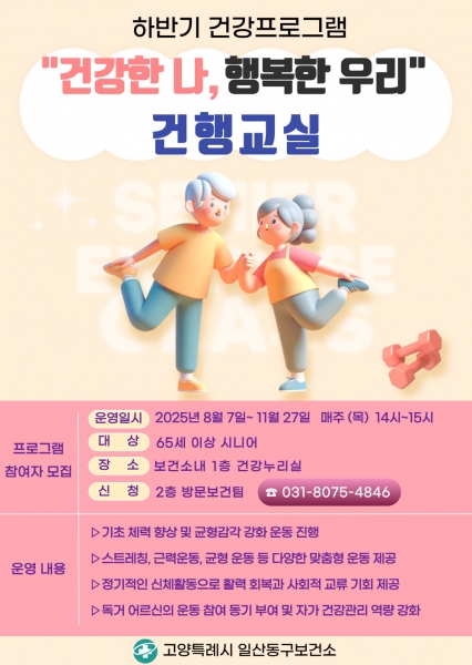 [금요저널] 고양특례시 일산동구보건소는 8월 7일부터 11월 27일 매주 목요일 오후 2시부터 3시까지 동안 보건소 1층 건강누리실에서 관내 65세 이상 독거 어르신 20여명을 대상으로 운동 중심 정서 지원 프로그램 ‘건강한 나, 행복한 우리 건행교실’을 운영한다고 밝혔다.