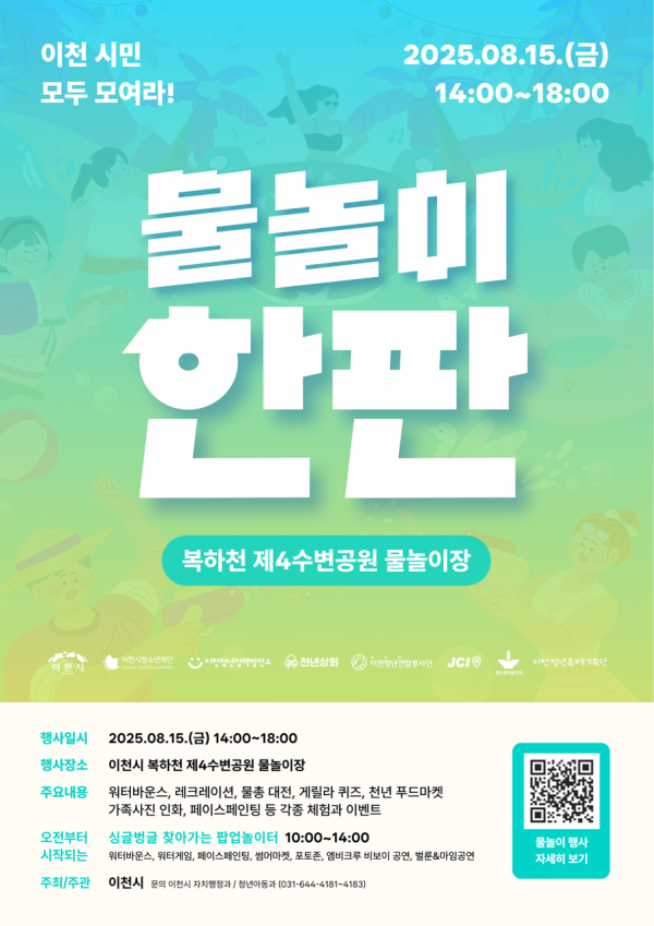 [금요저널] 이천시는 제30회 이천시민의 날과 광복절을 기념해 시민 모두가 함께 즐기며 무더위를 날릴 수 있는 특별한 여름 축제 ‘이천물놀이한판’을 오는 8월 15일 복하천 수변공원 물놀이장에서 개최한다고 밝혔다.
