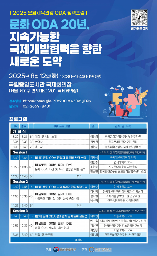 [금요저널] 문화체육관광부는 한국문화관광연구원과 함께 8월 12일 오후, 국립중앙도서관에서 문화 공적개발원조 20주년을 맞이해 ‘지속 가능한 국제개발협력을 향한 새로운 도약’을 주제로 ‘2025 문화·체육·관광 공적개발원조 정책 포럼’을 개최한다.