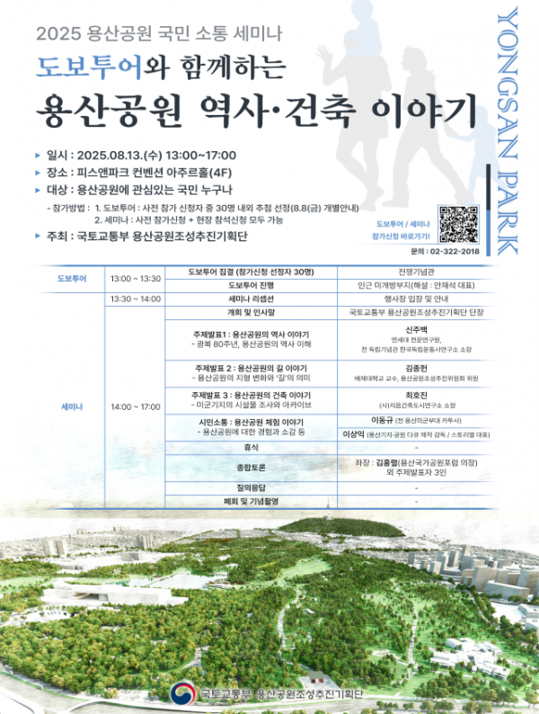 이번 세미나는 광복 80년을 맞아, 오랜 세월 군사적 요충지로 사용되어 왔던 용산이라는 공간의 역사적 의미를 되새겨 보고 국가공원을 조성하기 위한 지형과 시설물의 조성·활용 방안에 대해 전문가와 국민의 다양한 의견을 듣고자 마련했다.