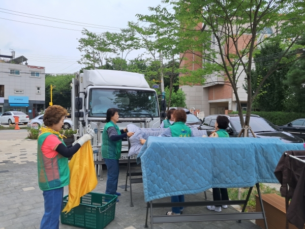이날 부녀회원들은 세탁이 어려운 저소득 가구를 직접 방문해 이불 등을 수거하고 세탁기와 건조기를 갖춘 이동 세탁 차량에서 세탁·건조 작업을 진행했다.