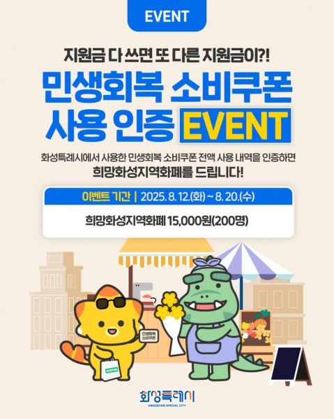 화성특례시에서 사용한 민생회복 소비쿠폰 전액 사용내역을 인증하면 추첨을 통해 총 200명에게 ‘희망화성지역화폐’ 1만 5천 원을 증정한다.