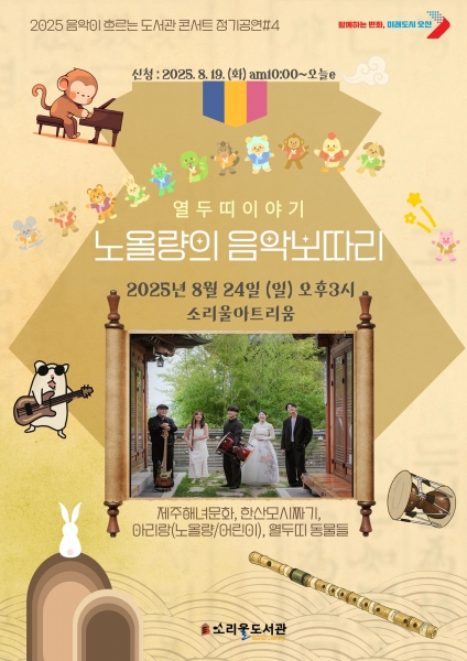 [금요저널] 오산시 소리울도서관은 오는 8월 24일 오후 3시, 소리울아트리움에서 ‘2025 음악이 흐르는 도서관 콘서트 정기공연 #4 – 노올량의 음악보따리’를 개최한다고 밝혔다.