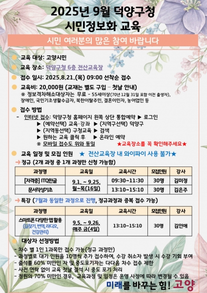 [금요저널] 고양특례시 덕양구는 고양시민을 대상으로 하는 제7차 시민정보화교육 정규과정과 9월 특강 접수를 오는 21일 오전 9시부터 시작한다.