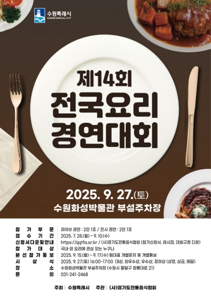수원시가 주최하고 경기도전통음식협회가 주관하는 제14회 수원 전국요리경연대회는 ‘빛나는 맛, 새로운 수원’을 주제로 9월 27일 오전 9시부터 오후 5시까지 수원화성박물관 부설주차장에서 열린다.