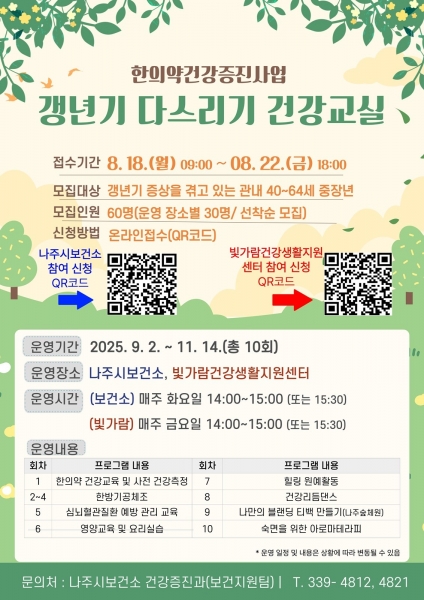 [금요저널] 전라남도 나주시는 갱년기 증상을 겪고 있는 중장년을 대상으로 한 한의약 기반 건강증진 프로그램인 ‘갱년기 다스리기 건강 교실’을 9월 2일부터 11월 14일까지 운영한다고 밝혔다.