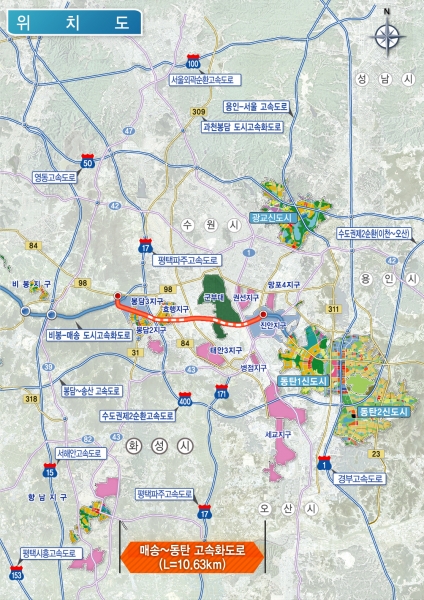 ‘매송~동탄 고속화도로’는 화성시 매송면 원평리에서 반정동을 연결하는 길이 약 10.63km의 왕복 4차로 고속화도로다.