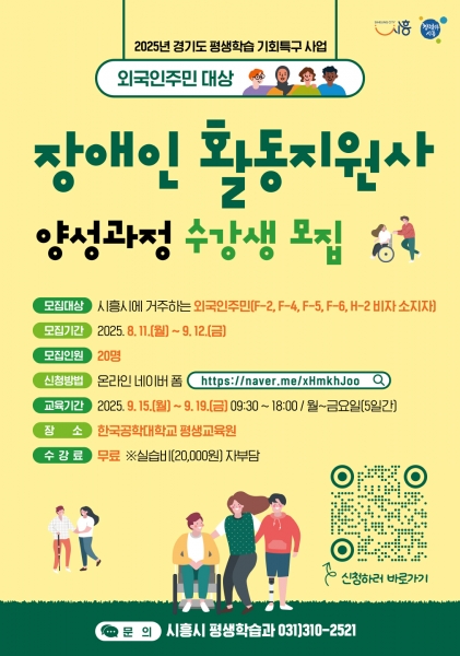 [금요저널] 시흥시는 2025년 경기도 평생학습 기회특구 사업의 일환으로 외국인주민의 안정적인 지역 정착과 취업을 지원하기 위해 ‘장애인활동지원사 양성과정’을 개설하고 오는 9월 12일까지 수강생을 모집한다.
