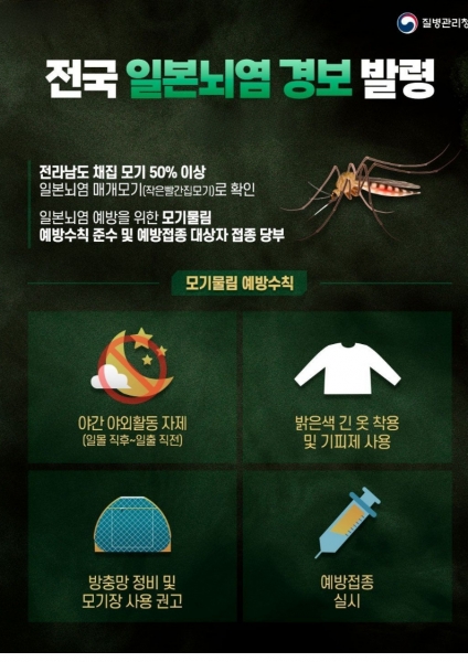 일본뇌염 바이러스에 감염되면 대부분은 무증상이지만, 일부에서는 고열·두통·의식 저하 등 뇌염 증상이 발생해 사망에 이를 수 있어 주의가 필요하다.