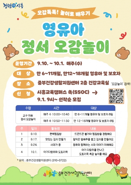 [금요저널] 시흥시보건소 중부건강생활지원센터는 관내 영유아의 건강한 성장과 발달을 돕기 위한 ‘오감톡톡 놀이로 배우기’- 영유아 정서 오감놀이 교육을 오는 9월 10일부터 10월 1일까지 매주 수요일 총 4회에 걸쳐 운영한다.