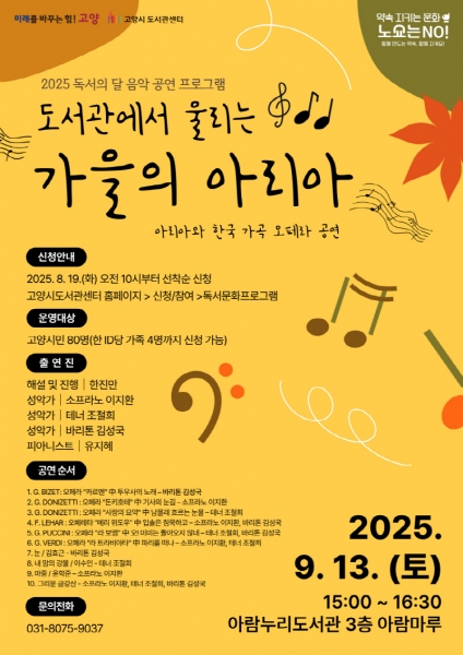 [금요저널] 고양특례시 아람누리도서관은 2025년 독서의 달을 맞아 오는 9월 13일 오후 3시, 아람누리도서관 3층 아람마루에서 시민들을 위한 특별한 음악 공연 ‘도서관에서 울리는 가을의 아리아’를 개최한다.