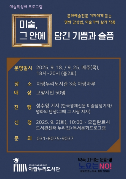 [금요저널] 고양특례시 아람누리도서관은 오는 9월 18일 25일 오후 6시부터 8시까지 시민을 위한 예술특성화 프로그램‘미술, 그 안에 담긴 기쁨과 슬픔’을 운영한다.