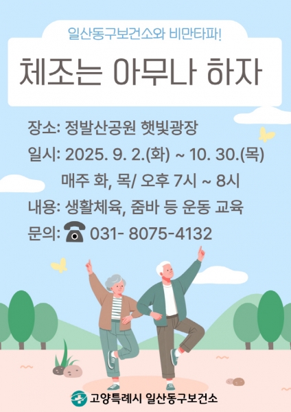 [금요저널] 고양특례시 일산동구보건소는 건강마을 조성사업의 일환으로 지역 주민의 건강 생활 실천을 돕고 비만율을 낮추기 위해 오는 9월부터 10월까지 두 달간 신체활동 프로그램 ‘체조는 아무나 하자'를 운영한다.