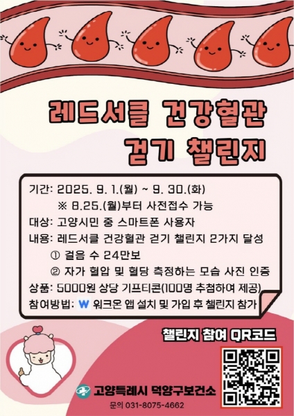 [금요저널] 고양특례시 덕양구보건소는 심뇌혈관질환 예방관리 주간을 기념해 9월 1일부터 9월 30일까지 워크온 앱을 활용한 ‘레드서클 건강혈관 걷기 챌린지’를 운영한다고 밝혔다.