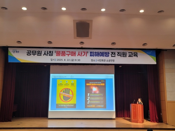 [금요저널] 파주시는 최근 전국적으로 확산되고 있는 ‘공무원 사칭 물품구매 사기’로부터 피해를 예방하고 직원들의 대응 역량을 강화하기 위해 지난 22일 시민회관 소공연장에서 전 직원을 대상으로 예방 교육을 실시했다고 밝혔다.