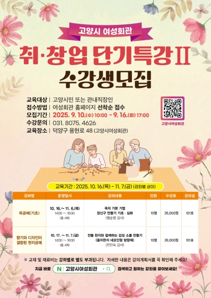 [금요저널] 고양특례시 여성회관은 시민들의 창의력 증진과 실생활 활용 가능한 기술 습득을 돕기 위해 ‘취·창업 단기특강Ⅱ’ 수강생을 모집한다.