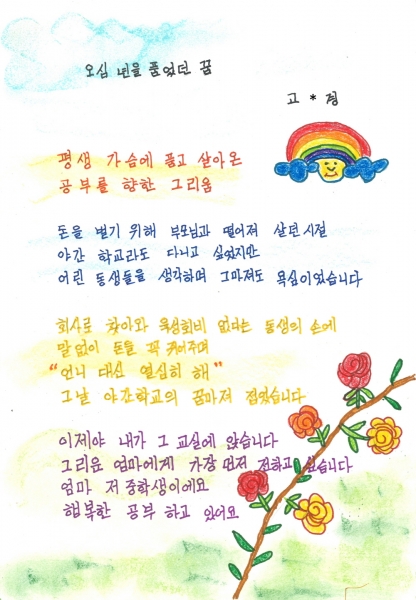 고양시에서는 높빛희망학교의 고경 어르신이 ‘오십 년을 품었던 꿈’ 으로 시화 부문 최우수상을 수상했으며 이 밖에도 19명의 학습자가 시화와 엽서 부문에서 수상의 영예를 안았다.