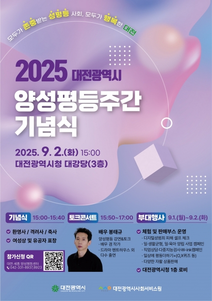 [금요저널] 대전시는 2025년 양성평등주간을 맞아 오는 9월 1일부터 7일까지 기념주간을 운영하며 이에 앞서 9월 1일부터 4일까지 시청과 대전YWCA 일대에서 다양한 행사를 개최한다.