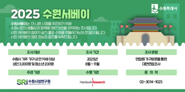 [금요저널] 수원시정연구원이 수원시민의 삶의 질과 시정 정책에 대한 의견을 파악하기 위한 ‘2025 수원서베이’를 시행한다고 29일 밝혔다.