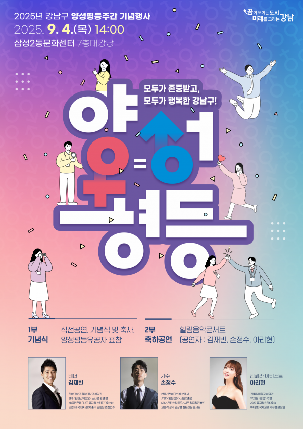 조성명 강남구청장은 “성평등은 거창한 구호가 아니라, 일상에서 서로를 존중하고 배려하는 작은 실천에서 시작된다”며 “이번 행사가 주민 모두가 서로의 가치를 존중하고 함께 웃을 수 있는 따뜻한 시간이 되길 바란다”고 밝혔다.