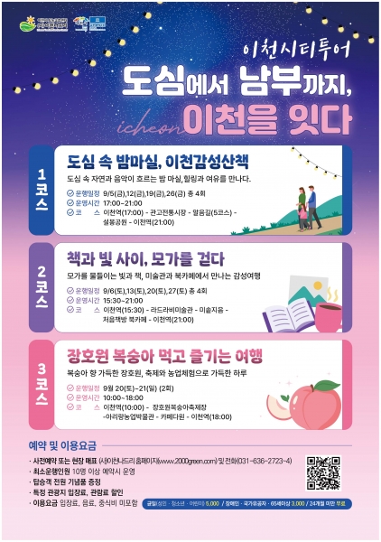 이번 9월 기획 투어는 △야간 도심을 산책하며 야경을 즐기는 ‘도심 속 밤마실, 이천 감성 산책’ △미술관과 북카페에서 감성을 느끼는 ‘책과 빛 사이, 모가를 걷다’ △장호원복숭아축제와 농업 체험을 함께 즐기는 ‘장호원 복숭아 먹고 즐기는 여행’ 코스로 총 3가지 테마로 운영된다.