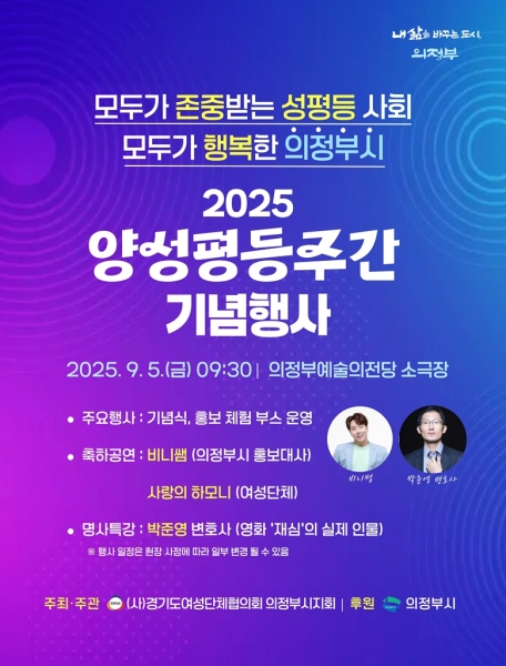 양성평등주간을 기념하기 위한 이번 행사에서는 ‘모두가 존중받는 성평등 사회, 모두가 행복한 의정부시’라는 슬로건과 함께 양성평등 실천 의지를 다지는 시간을 가진다.