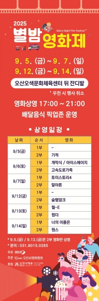 [금요저널] 오산시는 오는 9월 5일부터 9월 14일까지 매주 금·토·일 저녁, 오산천에서 시민들이 야외에서 영화를 즐길 수 있는 ‘2025 제3회 오산천 별밤영화제’를 개최한다고 밝혔다.