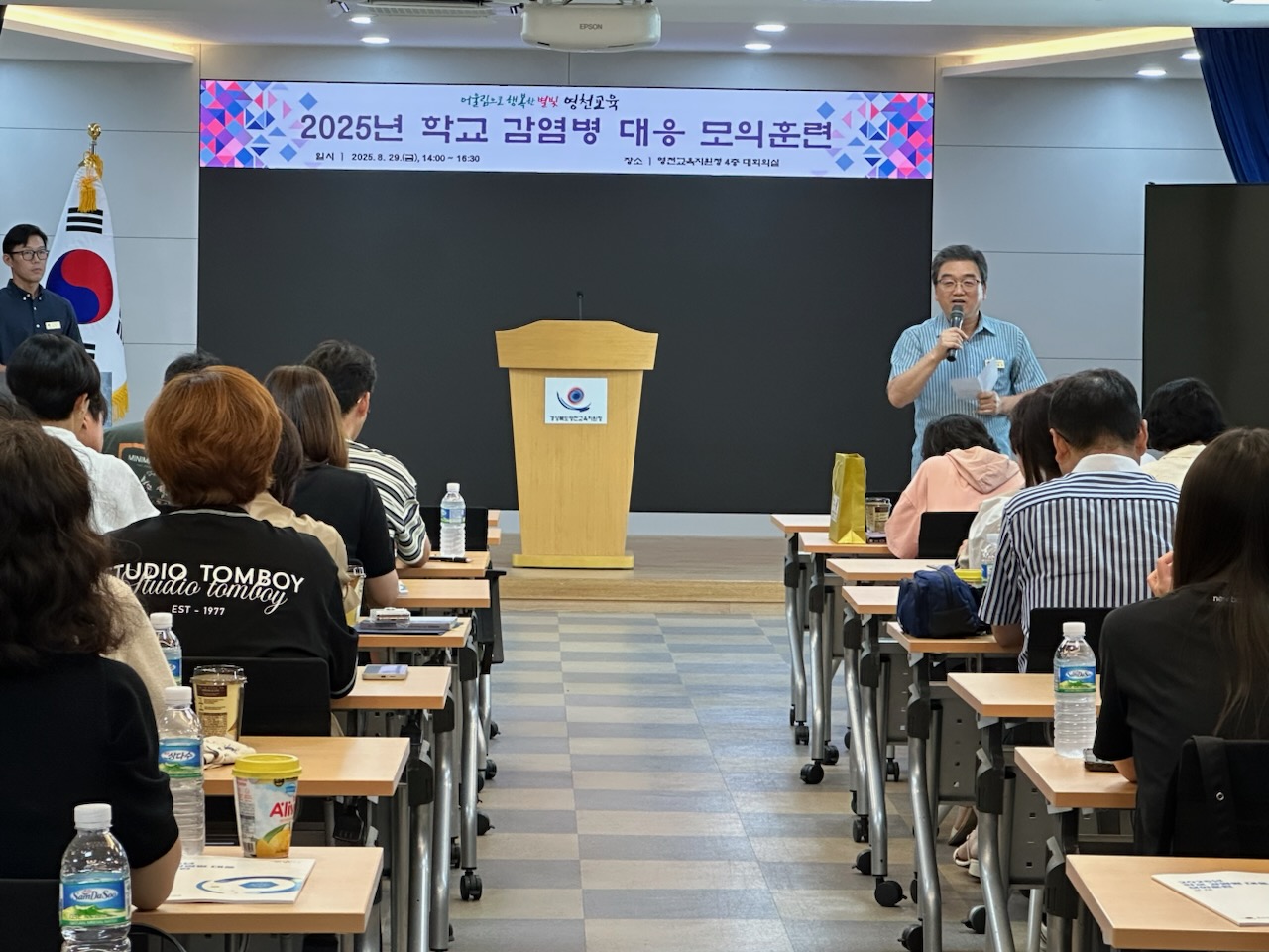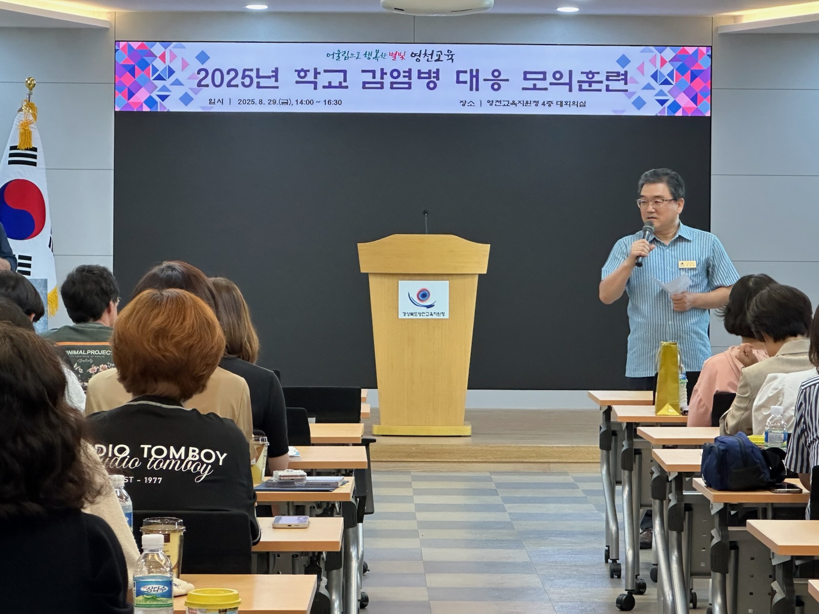 경상북도영천교육지원청(교육장 신봉자)은 2025년 8월 29일(금), 영천교육지원청 4층 대회의실에서 각급 학교 교감 및 보건(담당)교사 80여 명을 대상으로 「2025년 학교 감염병 대응 모의훈련」을 실시하였다.