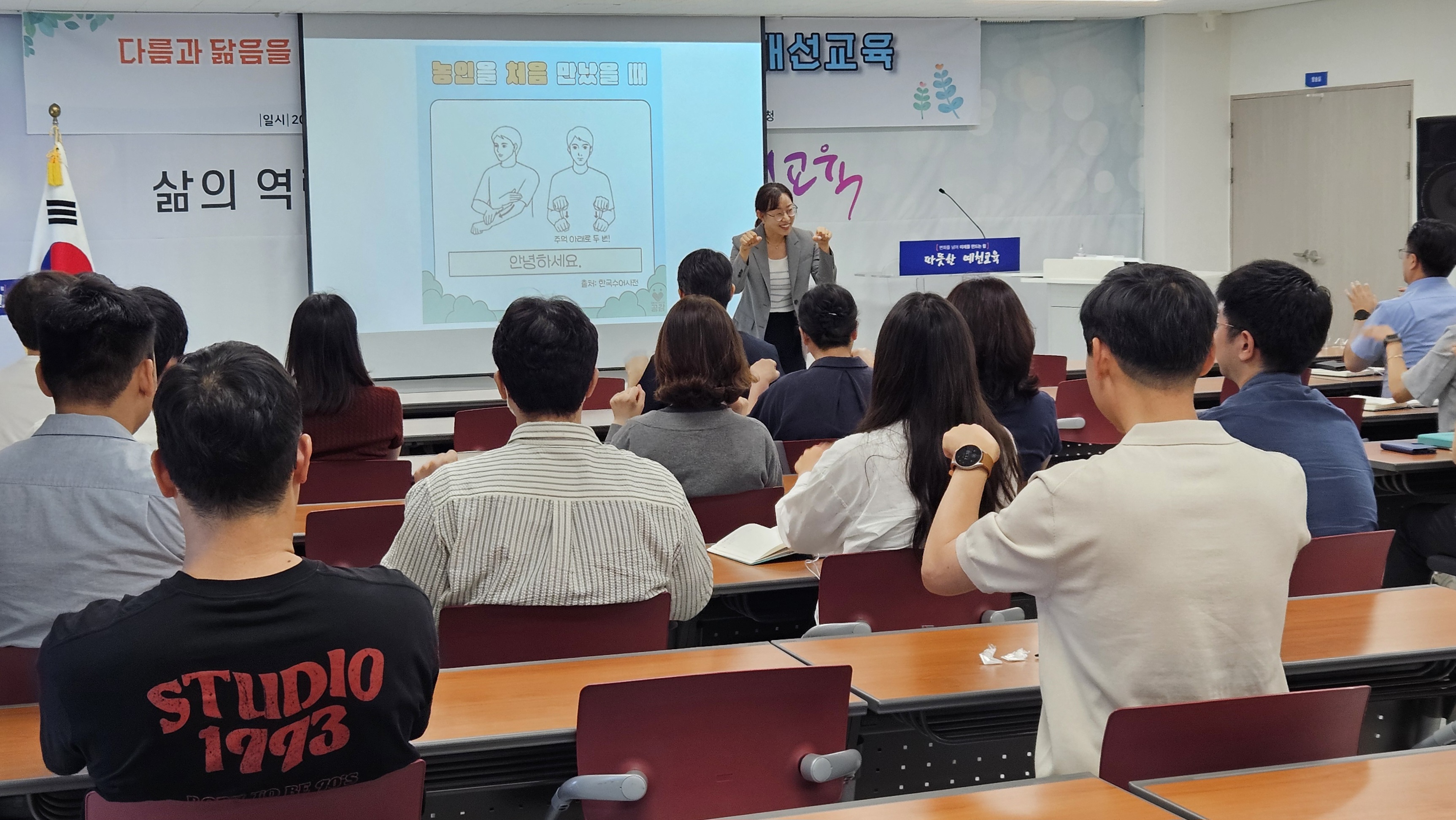 교육은 장애인식개선 전문강사인 다름아름교육연구소 박은주 대표가 진행하였으며, ▲장애에 대한 이해와 긍정적 인식 제고 ▲장애의 다양성 존중 ▲생활 속에서 활용할 수 있는 기초 수어 학습 등의 내용으로 구성하였다.