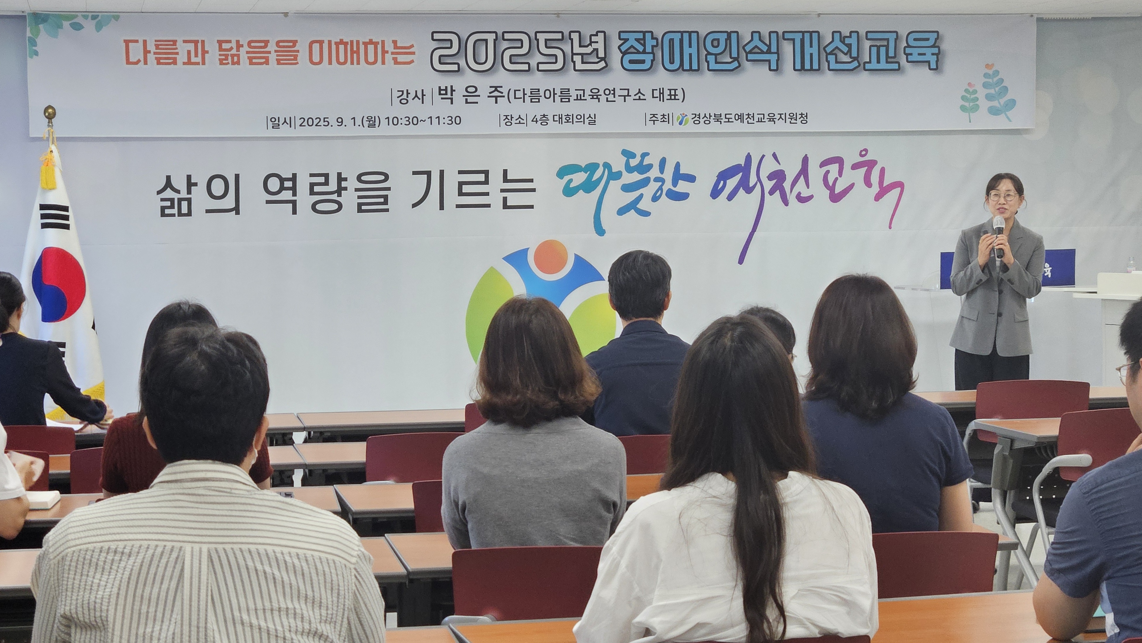 경상북도예천교육지원청(교육장 김성중)은 9월 1일(월) 임시청사 4층 대회의실에서 교육지원청 및 예천도서관 직원 60여 명을 대상으로 ‘2025년 장애인식개선교육’을 실시했다.