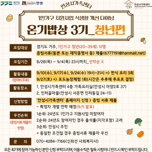[금요저널] 안성시 가족센터는 1인 가구 청년층을 대상으로 ‘식생활 개선 다이닝 – 온기밥상 3기’ 프로그램 참여자를 모집한다.