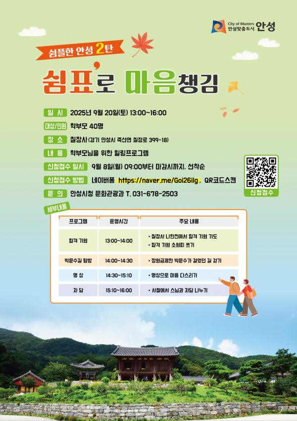 [금요저널] 안성시는 오는 9월 20일 오후 1시부터 4시까지 죽산면 칠장사 일원에서 학부모를 위한 힐링 프로그램 ‘ 쉼플한 안성 2탄, 쉼표로 마음챙김’을 운영한다.