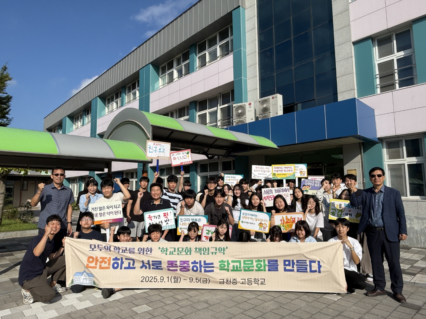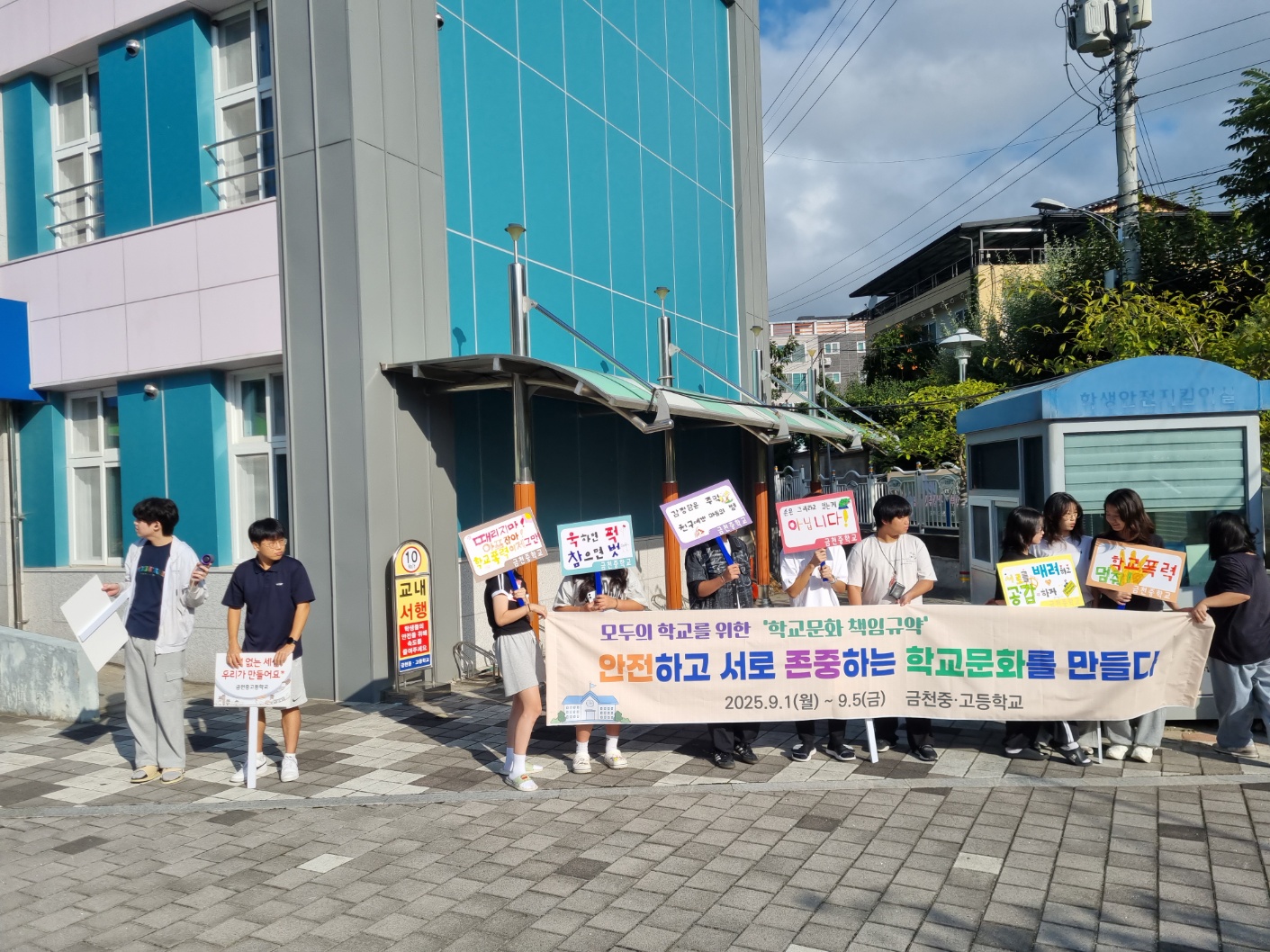 □ 금천중학교(교장 김준배)는 2025년 9월 4일(목) 오전 8시부터 8시 30분까지 학교 후문 주차장에서 전교생을 대상으로 ‘학교문화 책임규약’ 홍보 캠페인을 실시하였다. 이번 행사는 9월 학교폭력예방교육주간의 일환으로 진행되었으며, 학생들이 서로 존중하고 배려하는 건강한 학교 문화를 함께 만들어가자는 취지를 담고 있다.