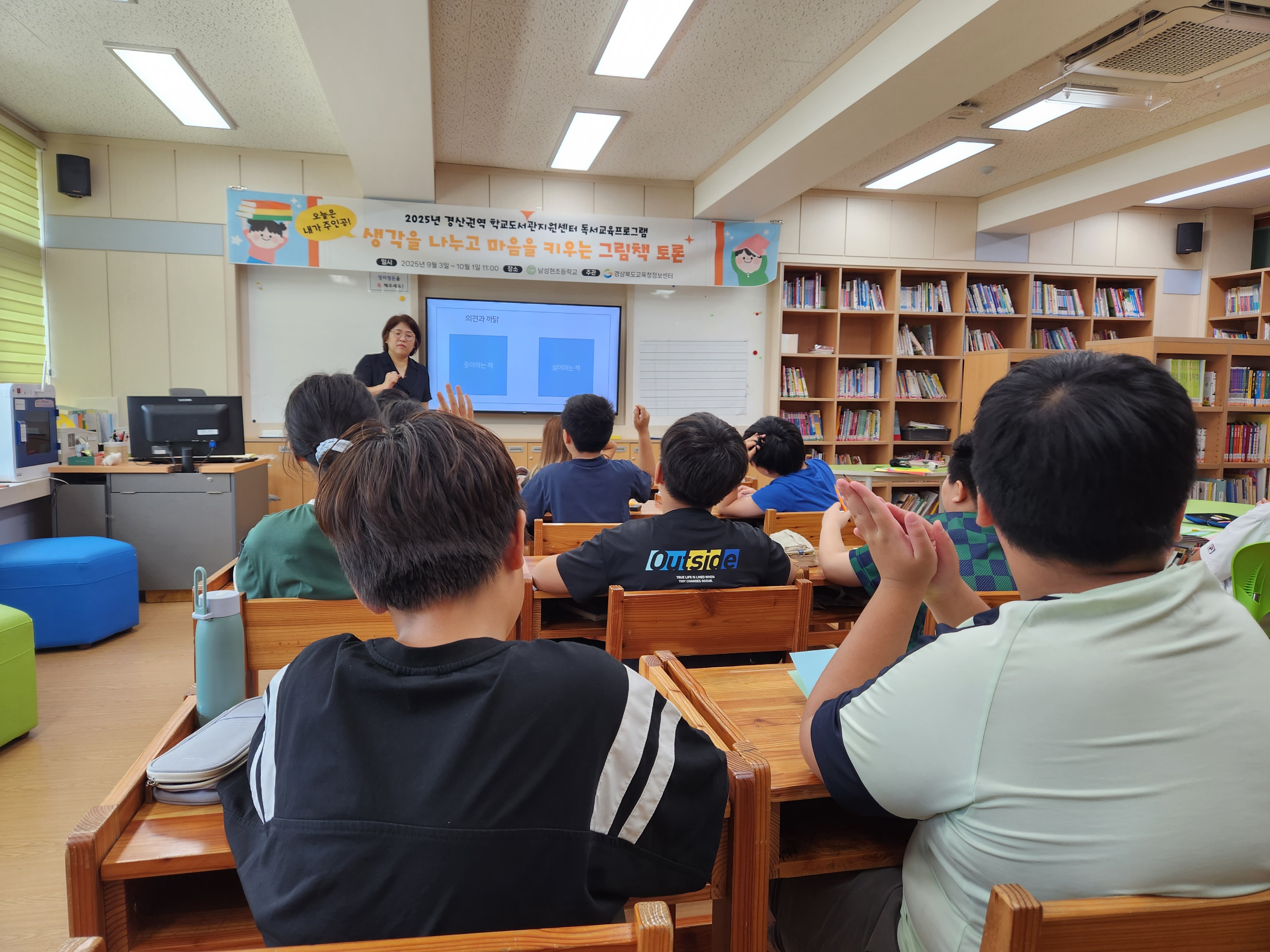 □ 남성현초등학교(교장 권○○)는 9월 3일(수)부터 10월 1일(수)까지 4번에 걸쳐 5~6학년 학생 15명을 대상으로 ‘생각을 나누고 마음을 키우는 그림책 토론’ 프로그램을 운영하고 있다.