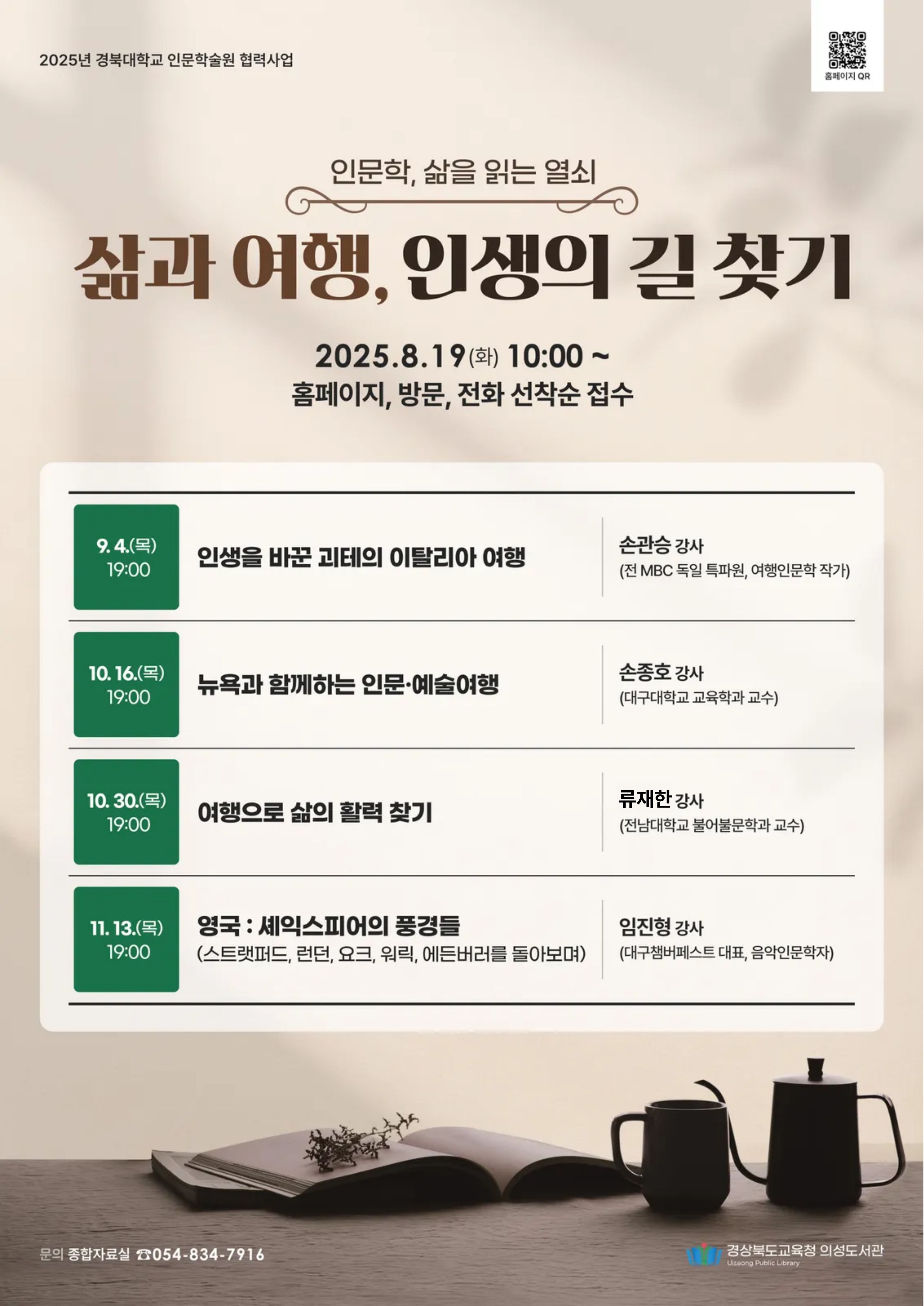 □ 경상북도교육청 의성도서관(관장 이미경)은 9월 4일 ‘인생을 바꾼 괴테의 이탈리아 여행’ 강연을 시작으로 11월 13일까지 ‘삶과 여행, 인생의 길 찾기’를 주제로 하반기 인문 독서 아카데미를 운영한다고 밝혔다.