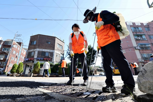 김찬진 청장은 여름철 방역취약지역을 직접 찾아 보건소 방역기동반과 함께 방역소독 활동을 진행하며 지역 내 감염병 예방에 힘썼다.