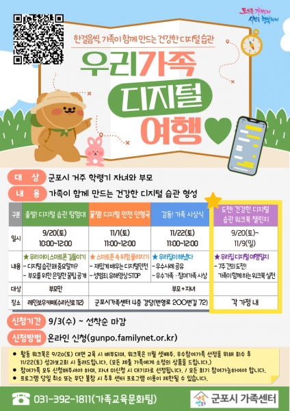 [금요저널] 군포시가족센터는 자녀의 스마트폰 사용 습관 형성이 필요한 가족을 대상으로 ‘우리 가족 디지털 여행’ 프로그램을 오는 9월 20일부터 11월 22일까지 총 4회에 걸쳐 운영한다고 밝혔다.