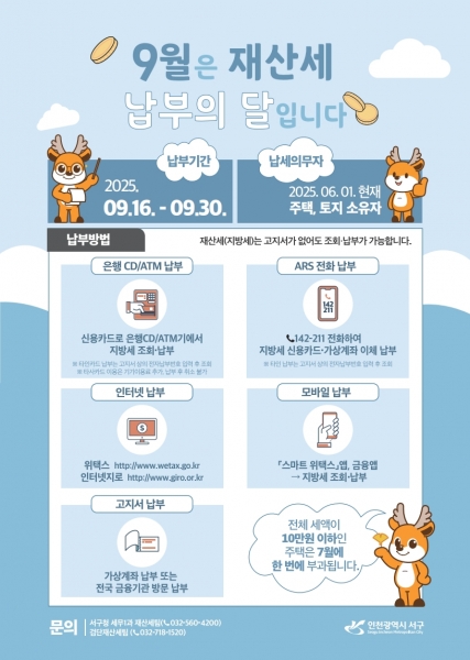 [금요저널] 인천 서구는 9월 정기분 재산세 26만 건, 1,450억원을 부과·고지 했다.