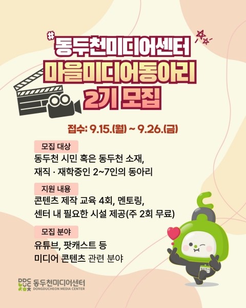 참가 신청은 동두천미디어센터 이메일을 통해 접수하며 신청서·동아리 소개서·개인정보 처리 동의서를 함께 제출해야 한다.