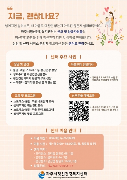 [금요저널] 파주시정신건강복지센터는 산모 대상 산후우울증 예방 교육 및 마음건강 선별검사 등 ‘행복맘 프로젝트’를 연중 운영하고 있다.