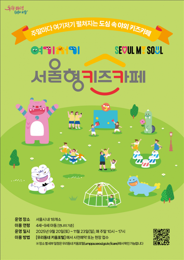 [금요저널] 1호점 오픈 이후 3년여 만에 누적 이용객 100만명을 돌파하며 서울시 대표 양육친화정책으로 자리매김한 ‘서울형 키즈카페’를 이제 매주 주말마다 한강, 공원, 광장, 학교 운동장 등 야외에서도 만날 수 있다.