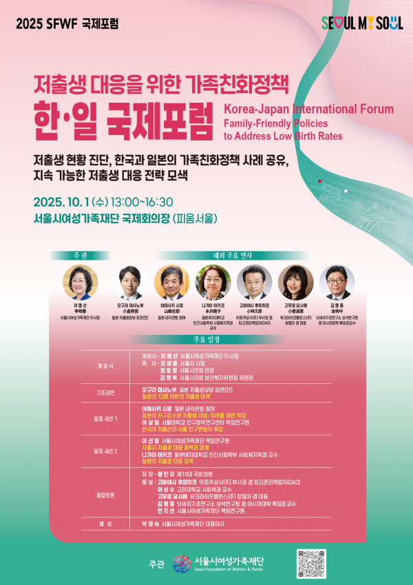 [금요저널] 서울시여성가족재단은 오는 10월 1일 오후 1시부터 4시 30분까지 서울여성플라자 국제회의장에서 ‘저출생 대응을 위한 가족친화정책 한·일 국제포럼’을 개최한다고 밝혔다.