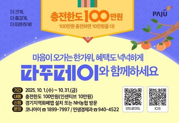 [금요저널] 파주시는 추석을 맞이해 시민의 생활비 부담을 줄이고 지역경제에 활력을 불어넣기 위해 10월 1일부터 31일까지 한 달간 파주페이 충전 한도를 최대 100만원까지 상향한다.