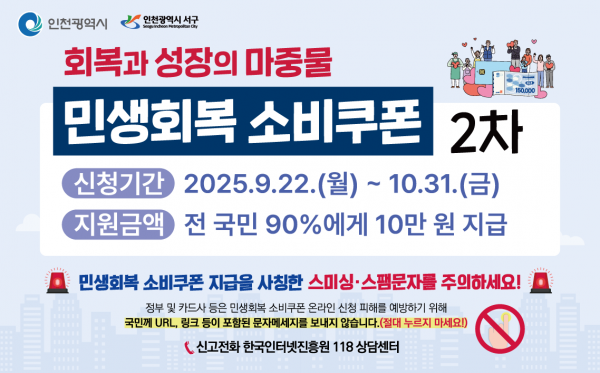 [금요저널] 인천 서구는 22일 민생회복 소비쿠폰 2차 신청 접수와 함께 불분명한 인터넷주소가 포함된 의심 문자에 각별히 주의해야 한다고 당부했다.