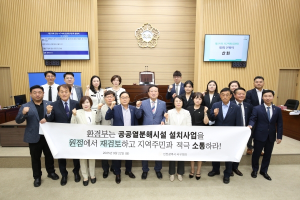 이에 서구의회는 결의안을 통해 △공공열분해시설 설치사업의 전면 중단 및 원점 재검토 △주민 환경권·건강권 보호를 위한 제도적 장치 마련 △수도권매립지 종료 정책과 상충되지 않도록 정부 간 정책 조율 강화 △탄소 감축과 기후변화 대응을 위한 지속 가능한 환경정책 추진 등을 중앙정부와 지방자치단체에 촉구했다.