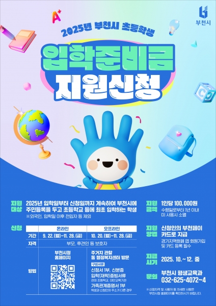 [금요저널] 부천시는 2025학년도 초등학교에 입학한 신입생을 대상으로 가정의 교육비 부담을 덜고 원활한 학교생활 적응을 돕기 위해 1인당 10만원의 입학준비금을 부천페이로 지급한다고 밝혔다.