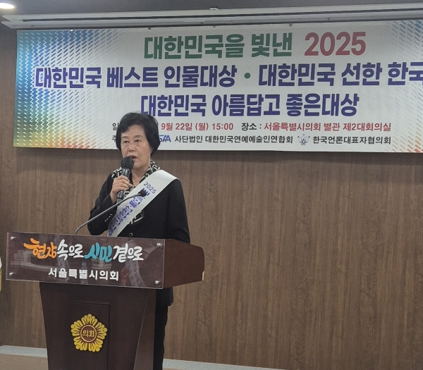 [금요저널] 경기도의회 건설교통위원회 박명숙 의원이 22일 서울시의회 별관 2층에서 열린 ‘2025 대한민국 베스트 인물대상’에서 광역의정대상에 선정되는 영예를 안았다.
